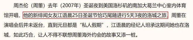 2007年的圣诞节,周杰伦在美国洛杉矶开演唱会,江语晨也在此进行5天3夜的旅行,不免引发大众联想。