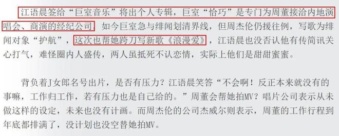 江语晨签约于巨室娱乐,这家公司是专门为周杰伦接洽内地演唱会和商演的经纪公司,关系匪浅。