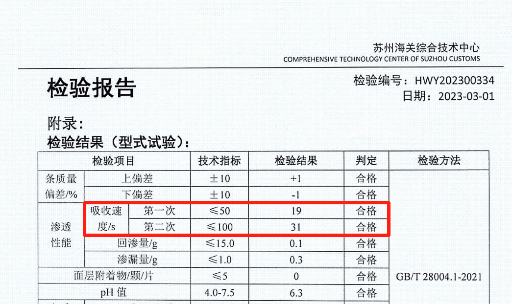 经权威机构检测,我们这款尿裤检测,第一次吸收速度只有 19 s,第二次仅 31 s,比国标要求要快得多。