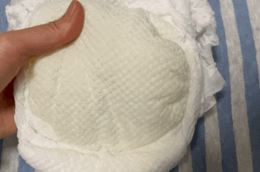 而且竟然一点儿也不反渗,纸尿裤表面摸起来非常干爽,用纸巾按压之后,纸巾依然干爽。