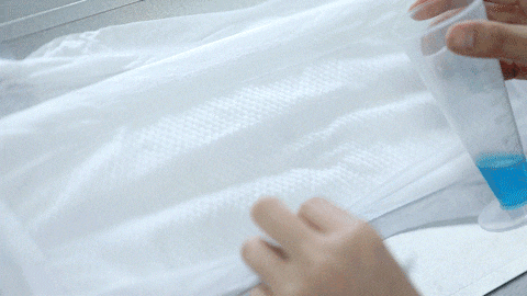 给大家测试一下,我们在尿裤侧围处,倒入模拟尿液的液体,可以清晰地看到,真的没有一滴水渗透过防侧漏层。